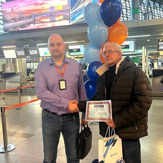 В ходе торжественной регистрации на рейс А47025 Москва – Апатиты пассажиру сертификат от авиакомпании Азимут и памятные сувениры от аэропорта Внуково вручены Олегу Новикову.